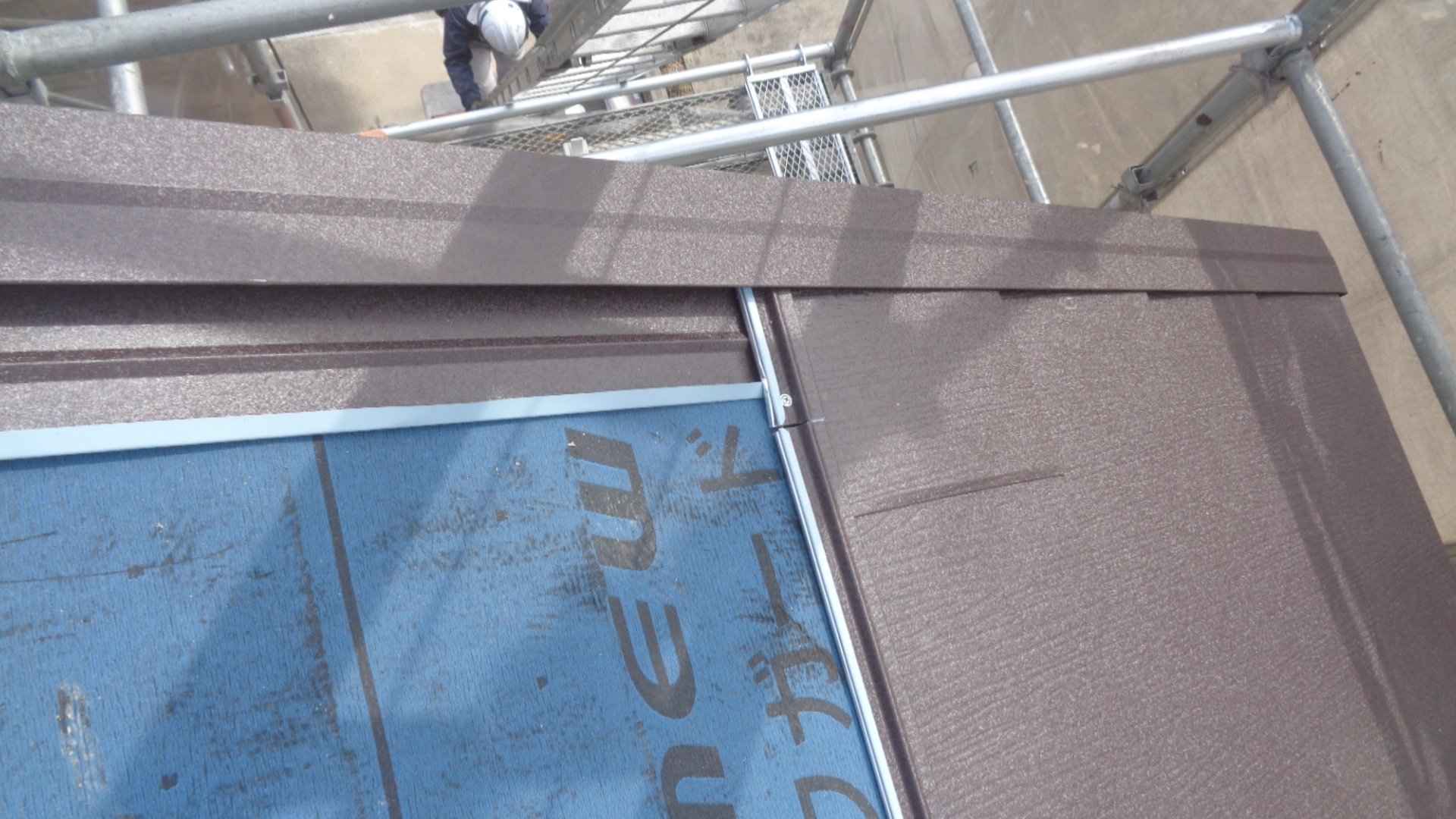 軒先から順に、本体屋根材をビス留めしながら重ねて屋根を葺いていきます。