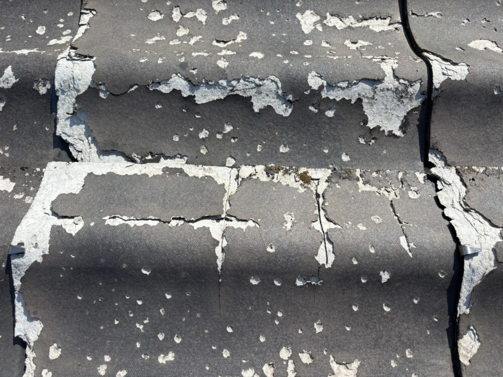 写真のように劣化によりヒビが入り、割れてボロボロになった瓦の破片が落ちてきていたのです。